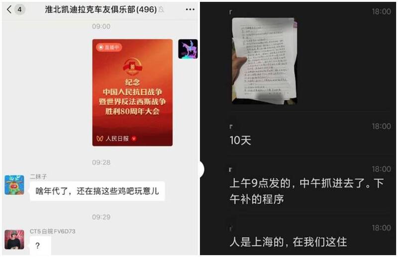 群組內疑似有人向公安舉報該名網友,因為才過短短3小時,批評閱兵的網友馬上被逮捕。另一個疑似是中國公安的聊天訊息截圖可見,公安透露被捕的網友40多歲,當天上午9點多發的訊息,中午就被抓進去,被判拘役10天。經調查,該網友是上海人,開的車是明明是豐田汽車而非凱迪拉克,不知為何會在安徽淮北市的凱迪拉克車友群。