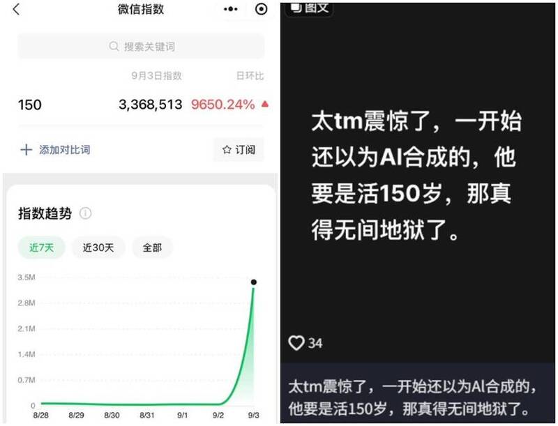 習近平說能活到150歲的消息終究還是被分享到牆內,旅義華僑作家李穎4日深夜在X平台「李老師不是你老師」牆內網友投稿,指出光是9月3日這天,「150」這個數字的「微信指數」出現異常飆升,與上個月3日相比,暴增了9650.24%,達到336萬8513次搜索量。還有中國人在抖音貼文哀號:「太TM震驚了,一開始還以為AI合成的,他要是活150歲,那真得無間地獄了……」