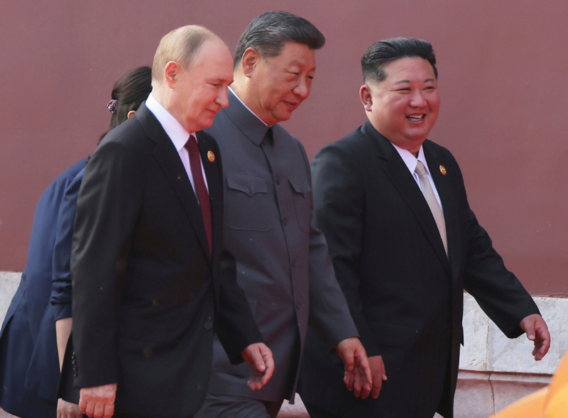 習近平與普廷、金正恩9月3日一同走向天安門城樓時,談到器官移植的私下對話被流出。(美聯社)
