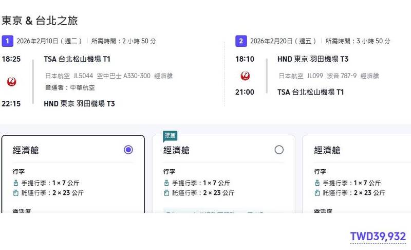 台北松山至日本羽田的來回機票價格大約要新台幣4萬元。(圖擷取自trip)