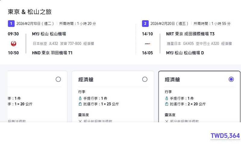 日本松山至日本羽田、日本成田的來回機票價格確實不用新台幣6000元。(圖擷取自trip)