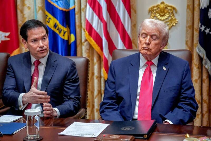 美國總統川普(右)2日在內閣會議上開嗆索馬利亞移民,左為國務卿魯比歐。(彭博社)