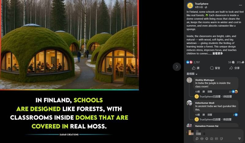 內容農場PO圖文說,芬蘭的學校為了營造真正的森林氛圍,每個圓頂教室都覆蓋苔蘚。(擷取自TrueSphere臉書)