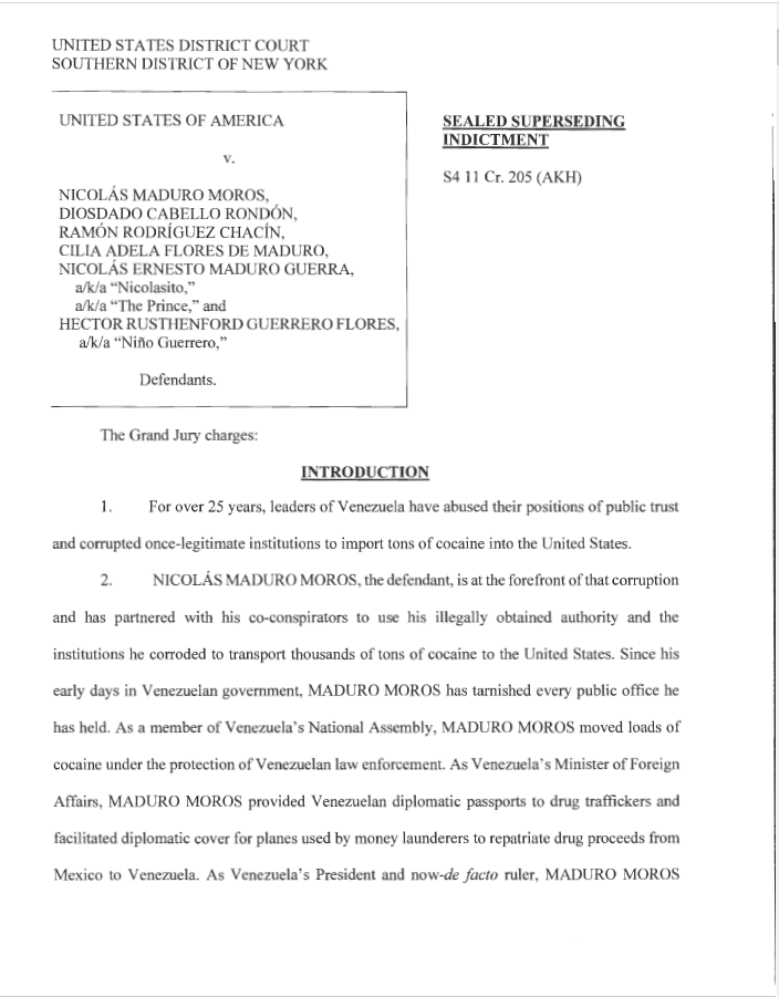 隨著美軍生擒委內瑞拉領袖馬杜羅(Nicolás Maduro)後,美國司法部隨即解密一份厚達25頁的重量級起訴書。這份由紐約南區聯邦地方法院簽署的最新追加起訴書(案號 S4 11 Cr. 205 (AKH)),首度將馬杜羅的妻子、兒子以及跨國黑幫首領全數列為被告,揭露其長達 25年利用國家力量支撐的「毒品恐怖主義」帝國。