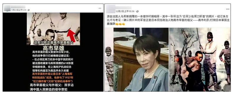 據《共同社》報導,假消息指稱高市早苗祖父叫做「高市早雄」,是二戰侵華日軍少佐,並附上「高市早雄」持刀對著跪地中國人的照片。然而,按照台灣事實查核中心先前的追查,這張照片實際上出自於1938年出版的《外人目睹中之日軍暴行》,並未記載這名日軍的姓名。