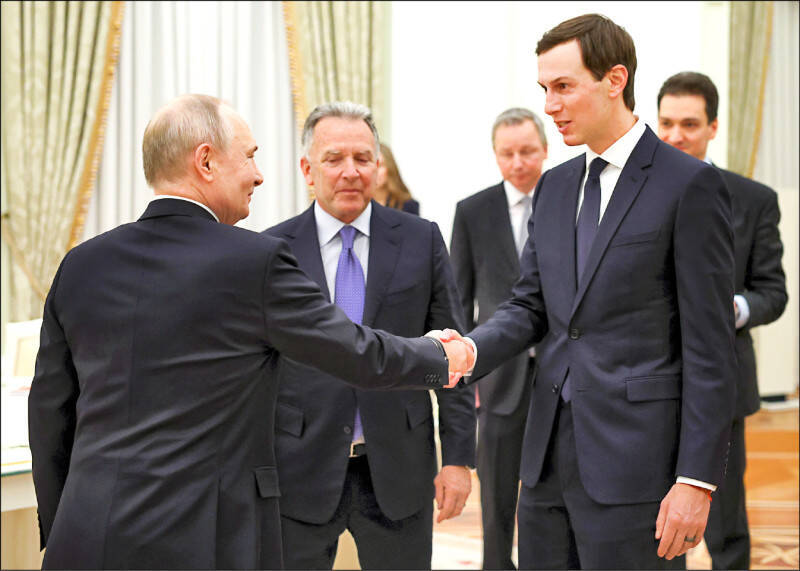 俄羅斯總統普廷(左)22日在莫斯科會晤美國特使魏科夫(中)及川普女婿庫希納(右)。雙方密商後隨即啟動阿布達比三方會談,然而俄軍卻在談判進行時同步狂炸基輔導致80萬人斷電。(歐新社)