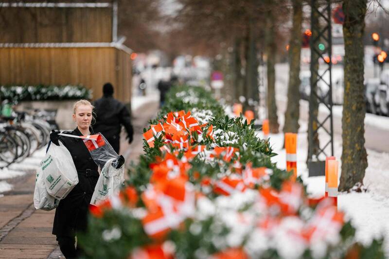 丹麥退伍軍人史塔爾(Maja Schlein Staal)28日在哥本哈根的美國大使館外,重新插上丹麥國旗紀念陣亡軍人。(法新社)