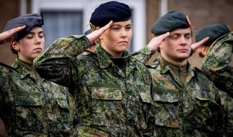 荷蘭王儲艾瑪莉亞公主(中)上月已率先完成軍事訓練並晉升下士;圖為她身穿迷彩服敬禮的畫面。(圖取自荷蘭國防部)