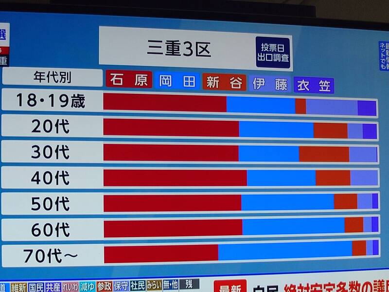 不過在第51回眾議院大選中,被岡田克也鞏固多年的三重第3選區,開票結果出乎所有人意料,他以9萬701票輸給自民黨候選人石原正敬的9萬9392票,連勝紀錄被正式中止。另據資料顯示,當地18歲至40多歲的選民,大多選擇投給石原正敬;50歲至60多歲的選民,也有半數以上投給石原正敬;唯有70歲以上的選民,傾向投給岡田克也。