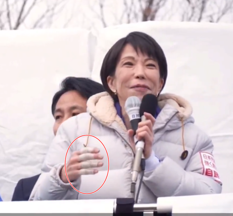 高市早苗先前在造勢活動上,被眼尖網友發現右手手指包了類似繃帶的東西。(圖翻攝自X平台)