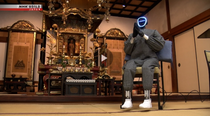 日本京都大學研發的AI「機器和尚」在寺廟內實測,不僅能做出雙手合十的祈禱姿勢,還能為人類解答人生煩惱。(翻攝自NHK畫面)