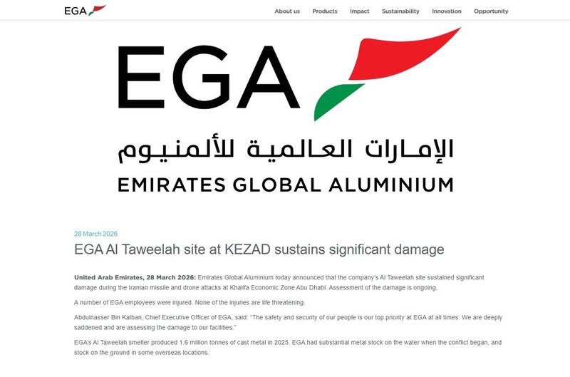 中東最大的鋁業製造商阿聯全球鋁業(EGA)今天表示,他們位於阿拉伯聯合大公國一處重要生產基地在伊朗飛彈與無人機攻擊中遭受「重大損害」。