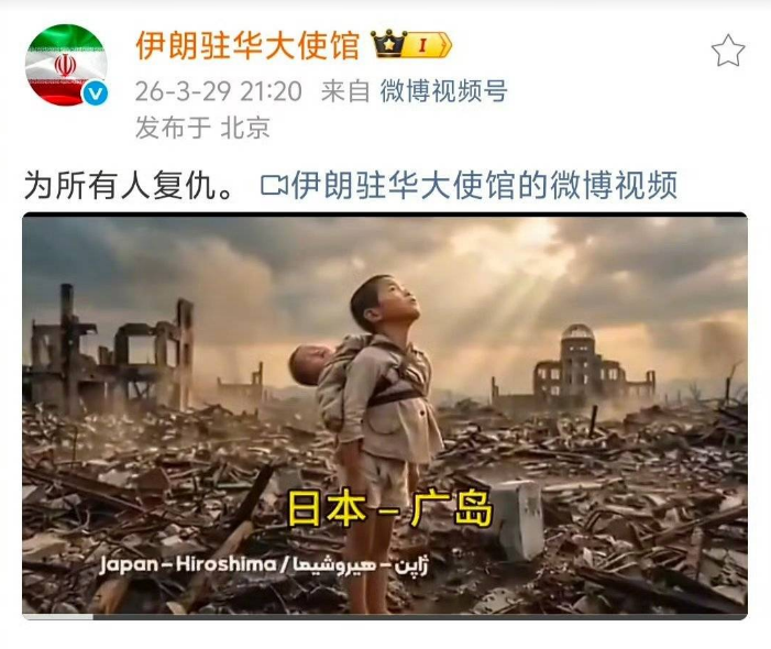 伊朗駐中國大使館微博所上傳的影片中,出現日本廣島、美洲原住民、越南、葉門、巴勒斯坦-加薩、艾普斯坦島、伊朗最高領袖哈米尼的AI生成片段,伊朗指稱要為上述「所有人復仇」。