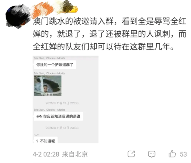 綜合中媒報導,根據網傳截圖顯示,這個擁有282人的微信群組「水花征服者聯盟」,群組公告中竟公然寫道「禁止攻擊其他運動員(全紅嬋除外)」,甚至在2025年11月更換新群規,明確指示成員可以「隨意地罵全紅嬋和王楚欽,照死裡罵」。群內成員不僅對全紅嬋冠以多種不堪入目的侮辱性綽號,更長期進行語言霸凌。