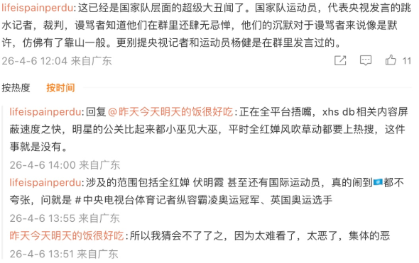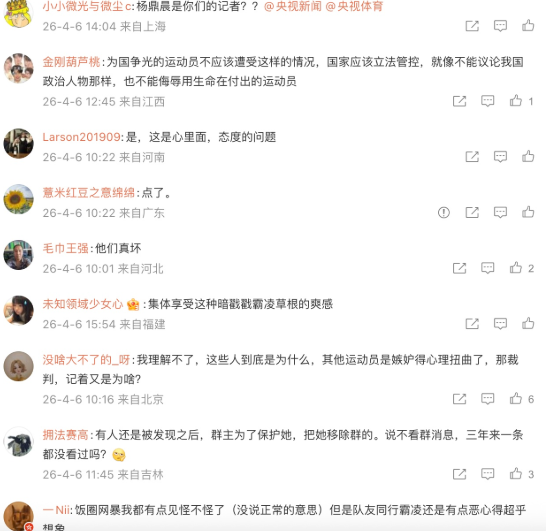 網友也怒批,「這已經是國家隊層面的超級大醜聞了。國家隊運動員,代表央視發言的跳水記者,裁判,謾罵者知道他們在群裡還肆無忌憚,他們的沉默對於謾罵者來說像是默許,彷彿有了靠山一般。更別提央視記者和運動員楊健是在群裡發言過的。」