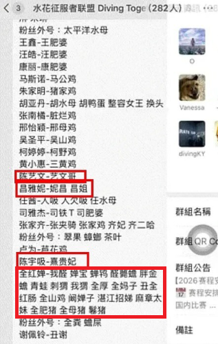 爆料指出,該群組的成員身分非同小可,包括多位中國知名跳水運動員如陳芋汐、昌雅妮、陳藝文、龍道一、楊健等,甚至連央視體育記者楊爍、跳水國際裁判饒琅以及運動員家屬也都在群組內。儘管成員間彼此知曉身分,卻無一人對群內的霸凌言論提出制止。據傳一名澳門跳水運動員因看不下去而退群,竟也遭到群內成員的集體攻擊。