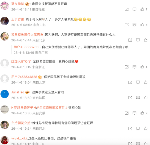 據悉,事件爆發於3月31日晚間,有網友在豆瓣論壇發文同情全紅嬋的處境,卻遭到競爭對手陳芋汐的粉絲激烈反駁。在爭執過程中,知情人士為平息紛爭,索性將該霸凌群組的聊天截圖公開,隨即引發輿論風波。
