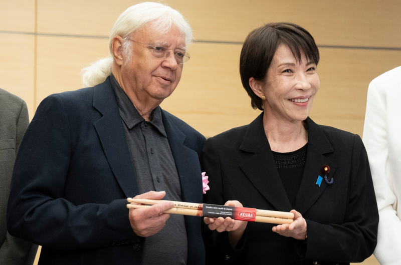 高市還準備了親筆簽名的鼓棒,送給Deep Purple的鼓手佩斯。(美聯社)