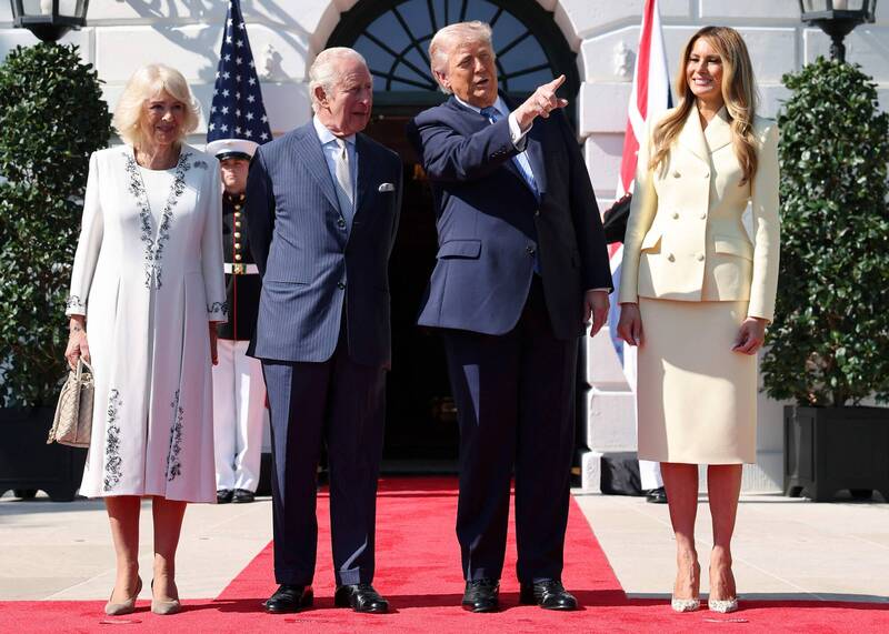 英國媒體《每日郵報》聲稱英國國王查爾斯三世(左2)與美國總統川普(右2)是表親。(法新社)