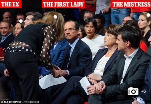 法國總統歐蘭德(Francois Hollande)的一連串緋聞成焦點,英國媒體翻出2年前歐蘭德競選總統時的舊照,當時歐蘭德的舊愛賀雅爾、「正牌女友」特里耶維勒與新歡茱莉嘉葉3個女人齊聚一堂,外界也揣測歐蘭德與茱莉嘉葉的戀情是從2年前持續至今。