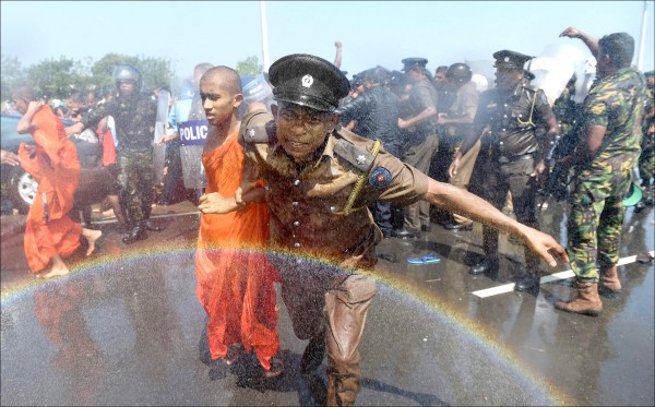 中國租期九十九年的斯里蘭卡南端港市赫班托達開發計畫,七日舉行動土儀式,民族主義人士、土地遭徵收的農民與僧侶團體在場抗議,遭警方以水砲鎮壓。(法新社)