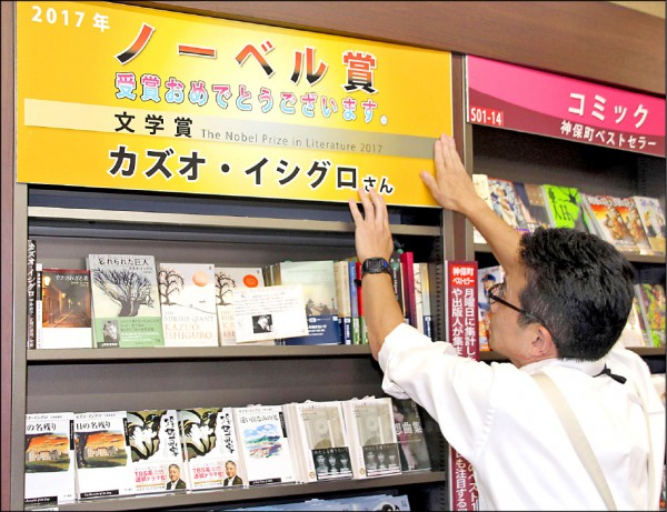 今年諾貝爾文學獎獎落日裔英國作家石黑一雄,東京一間書店搶搭熱潮,六日開闢作品專區,並寫上「謹祝榮獲諾貝爾獎」宣傳文字。(美聯社)