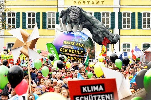 聯合國氣候變化綱要公約第廿三屆締約方大會(COP23)將於本月六日至十七日在德國首都波昂舉行。圖為抗議人士四日在波昂發起氣候大遊行,他們聚集在聯合國氣候變遷會議的會場外,高舉著一個冒出德國總理梅克爾面孔的黑煙的球體,要求停止使用化石燃料。(歐新社)
