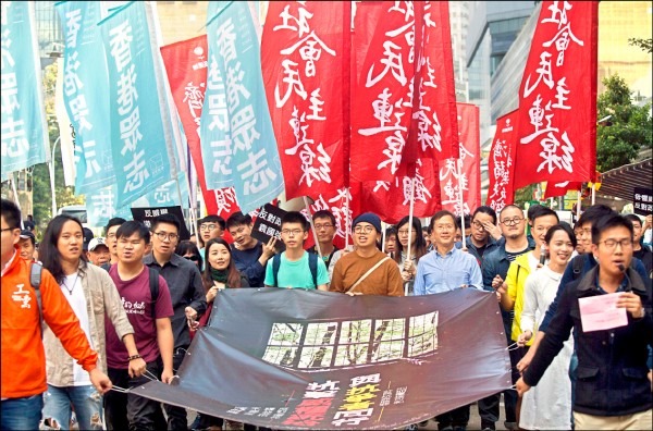 香港多個政黨與團體三日下午發動大遊行,反對中國及港府威權打壓,由坐牢六十九天、十月下旬才出獄的香港眾志祕書長黃之鋒(左六)等人領銜。(歐新社)