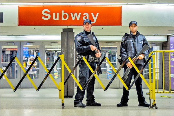 二十七歲孟加拉移民烏拉十一日上午在紐約曼哈頓的交通樞紐引爆自製炸彈。攻擊事件發生後,警方在時報廣場附近的紐新航港客運總站站崗。(美聯社)