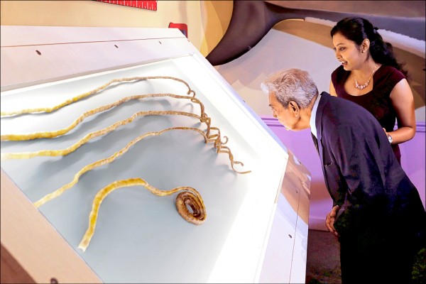 金氏世界紀錄「單手最長指甲」保持人、82歲的印度老翁奇拉爾11日應「信不信由你博物館」之邀於紐約出席典禮,剪掉他留了66年的指甲,放置於時報廣場分館展覽櫃珍藏。他從16歲開始留左手指甲,5隻指甲長度加總達909.6公分,其中最長的拇指指甲近2公尺。奇拉爾表示,他的指甲極其脆弱,就連睡覺時也小心翼翼,每半小時就要翻身一次,令他提心吊膽,唯恐指甲折斷。如今他年老體衰,手部多年來累積不少病痛,令他決心剪掉。圖為奇拉爾與孫女11日在館內參觀指甲。(圖:路透,文:編譯陳正健)