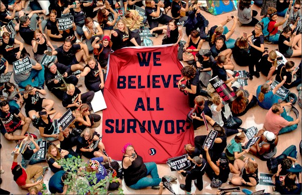 抗議群眾湧入哈特參院辦公大樓後,席地展開「我們相信所有倖存者」的標語。(法新社)
