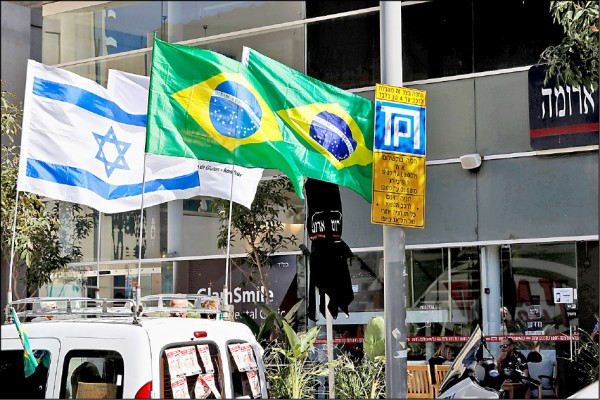 巴西駐以色列大使館,目前和世界上多數國家一樣,設在以國金融及科技創新中心特拉維夫。圖為懸掛兩國國旗的車輛停在巴西大使館外。(法新社檔案照)