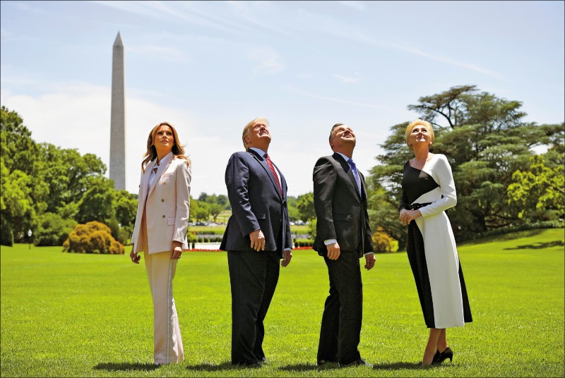 美國總統川普(左二)和第一夫人梅蘭妮亞(左一),十二日在白宮接待來訪的波蘭總統杜達夫婦(右一、二),並抬頭觀賞飛越白宮的一架F35匿蹤戰機。川普當天宣布,將增派一千名美軍至波蘭,協助抗衡俄羅斯。 (法新社)