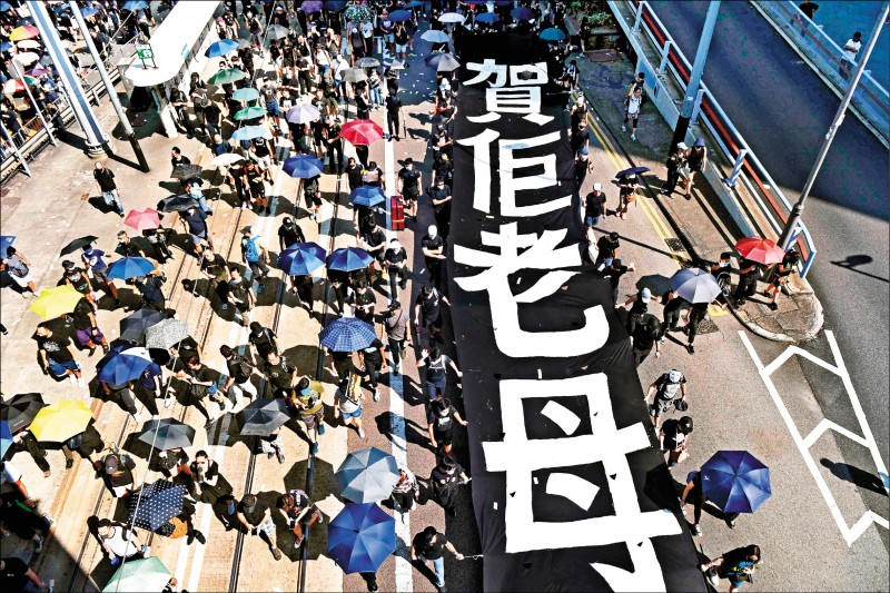在中共慶祝建政七十週年的十月一日,曾數次公開募資在全球多國報紙刊登「反送中」廣告的「G20團隊」,再次於英、德、西班牙、瑞典、挪威、加拿大、阿根廷、墨西哥和南韓九國報紙版面,刊登「十.一強國大壽,賀佢(他)老母」眾籌廣告,指控十月一日實為中國的國殤日,「共黨竊國七十年,殺害無數在獨裁土地上追求自由的國民,在此我們向英烈們表達崇高致意」。G20團隊指出,這僅是第一波行動,第二和第三波的網路和戶外攻勢,將於近日展開。圖為香港民眾在十月一日高舉「賀他老母」的巨型布條上街遊行,對中共的威權統治發出怒吼。