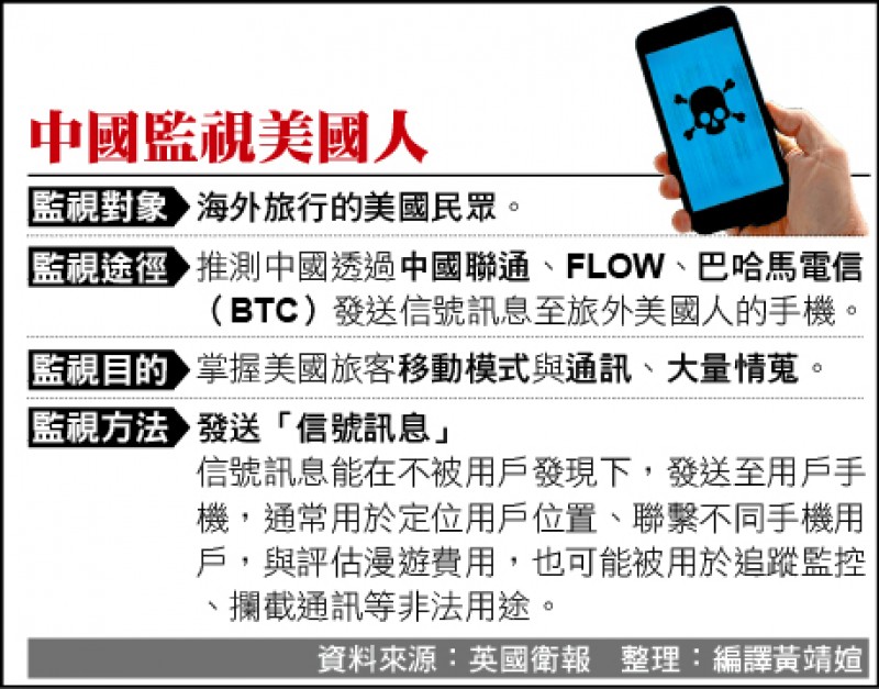 英國《衛報》十五日披露,中國利用全球電信網路存在數十年的漏洞,發送能夠定位手機用戶位置的信號訊息(Signalling message),鎖定、追蹤、攔截美國手機用戶的通話,大規模監視美國民眾。美國電信分析供應商「Mobileum」前高階主管、長年分析外國與美國電信商間的手機情報威脅報告的米勒(Gary Miller)認為,監視主要發生於美國民眾身處海外時,代表中國監視的主要目的是掌握美國旅客的移動模式與通訊。