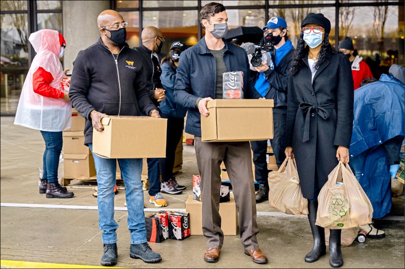 美國喬治亞州的兩名民主黨參議員候選人華諾克(左)和奧索夫(中),廿四日在亞特蘭大一同參與派發食物的活動。(彭博)