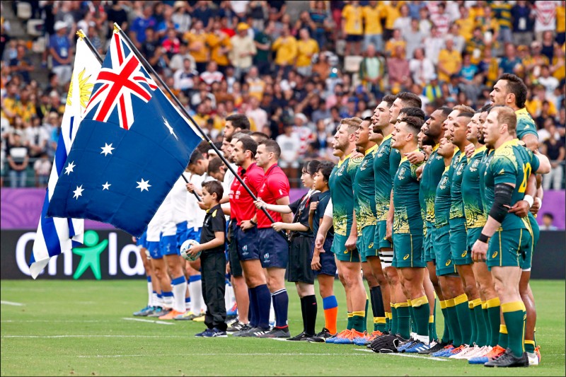 澳洲一日正式修改部分國歌歌詞,以反映原住民在這片大陸上的悠久歷史。圖為澳洲男子橄欖球國家隊去年十月間在日本參加世界盃橄欖球賽,在和烏拉圭隊的D組分組賽前唱國歌。(路透檔案照)