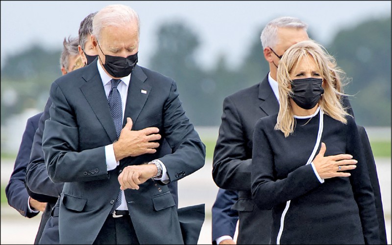 十三名美軍遺體廿九日由軍機載回美國德拉瓦州多佛空軍基地(Dover Air Force base),總統拜登親自迎靈。(法新社)