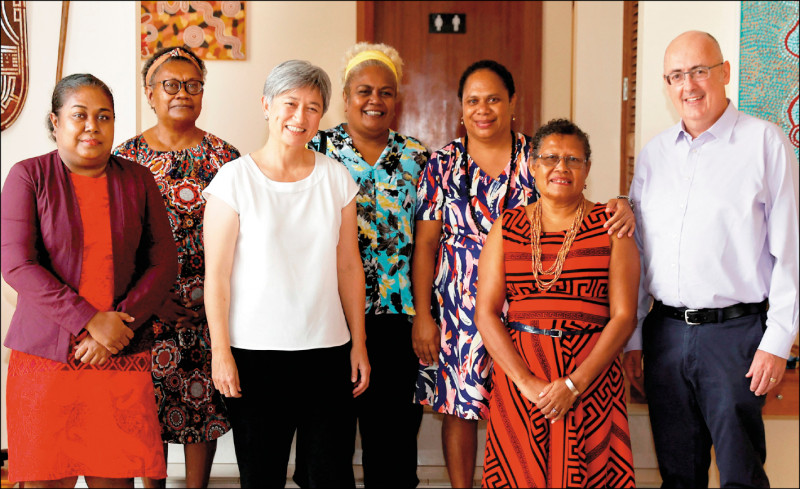 澳洲外交部長黃英賢(左三)17日前往索羅門群島進行一天訪問,這是自索國和中國在4月簽署安全協議後,澳洲最高層的官方訪問。她會晤索國總理蘇嘉瓦瑞時,重申「太平洋大家庭的安全應由我們自身負責」,蘇嘉瓦瑞則保證索國不會有軍事基地,澳洲仍是索國首要夥伴選擇。圖為黃英賢在荷尼阿拉會晤索國婦女領袖。(法新社)