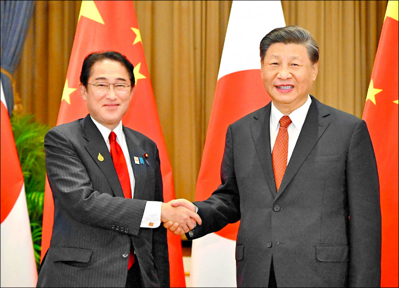 日本首相岸田文雄(左)與中國國家主席習近平,17日在曼谷舉行日中領袖時隔3年以來的第一場面對面高峰會。(路透)