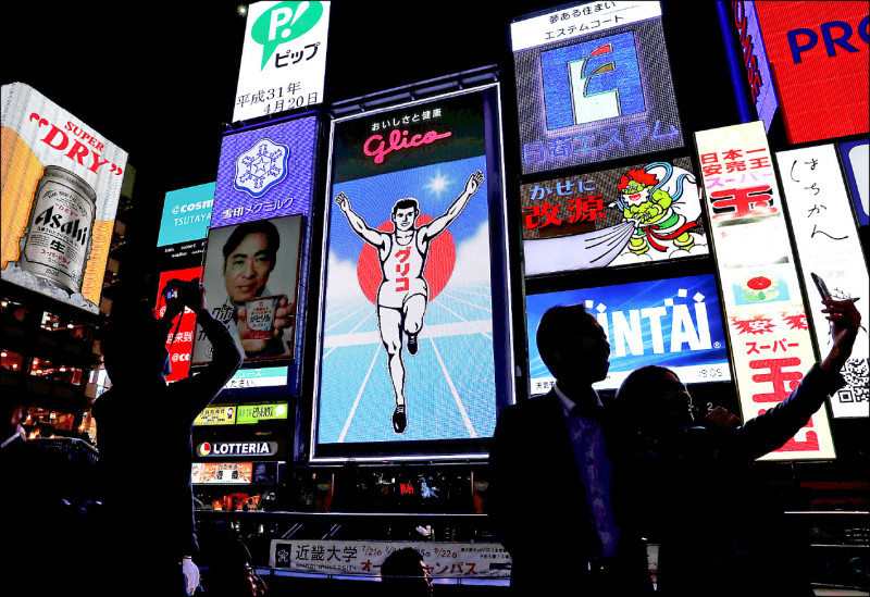 日本大阪鬧區道頓堀設置會用關西腔說謝謝的垃圾桶。圖為2019年4月民眾在大阪道頓堀自拍。(路透)