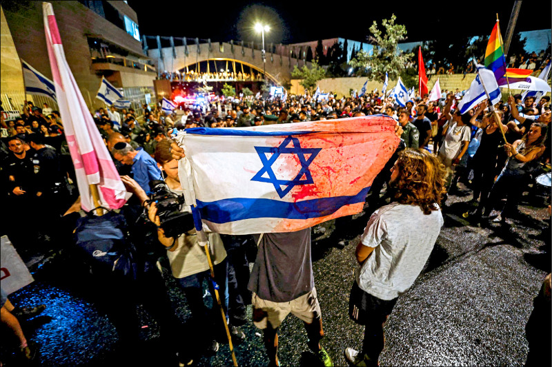 以色列國會24日通過爭議性司法改革的主要條款,限制最高法院推翻政府決策的權力,在耶路撒冷國會大廈附近和特拉維夫等地,都有大批民眾聚集抗議,以國恐陷入建國75年來最嚴重的內部危機。(美聯社)