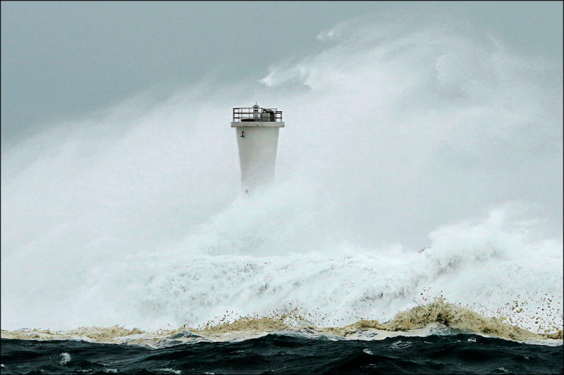 日本日前發現有主權爭議的北方四島上的一座燈塔在睽違9年後被俄羅斯點亮。圖為2019年10月日本三重縣紀寶町的一座燈塔挺立於颱風的狂風暴雨中。(美聯社)