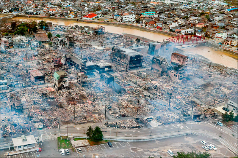 日本能登半島1日遭規模7.6強震侵襲,石川縣輪島市內觀光名勝「輪島朝市」大火延燒一夜,約200棟房屋燒毀,災情慘重。(法新社)