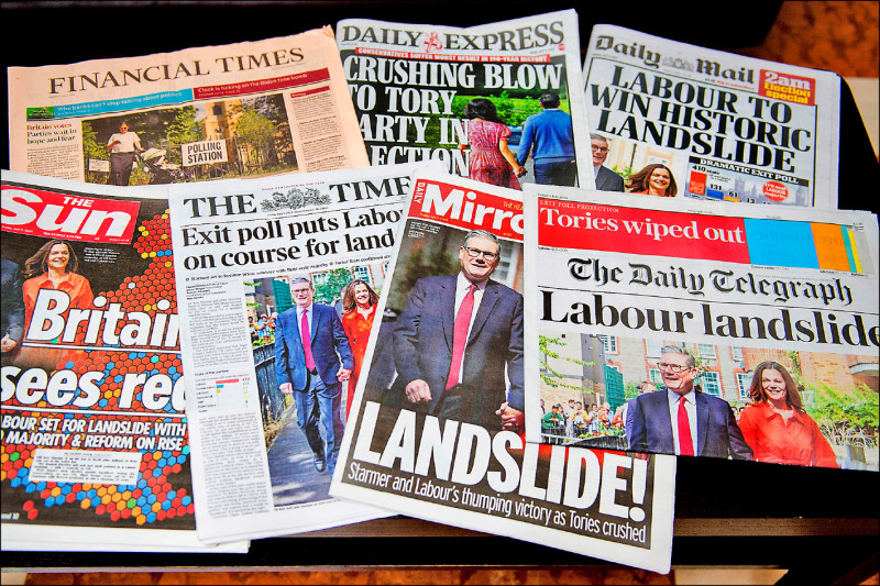 英國各家報紙報導工黨壓倒性獲勝,施凱爾出任首相。(美聯社)