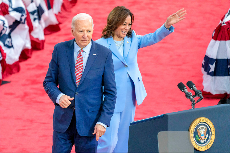 美國總統拜登(左)宣布退出競選連任,全力支持現任副總統賀錦麗(右)代表民主黨,迎戰共和黨總統候選人川普。(歐新社檔案照)