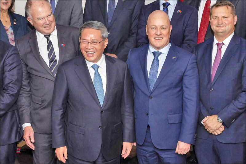 紐西蘭安全情報局3日發布年度安全環境威脅報告,將中國列為「複雜情報隱憂」。圖為紐西蘭總理盧克森(右)6月會見來訪的中國國務院總理李強(左)。(法新社檔案照)