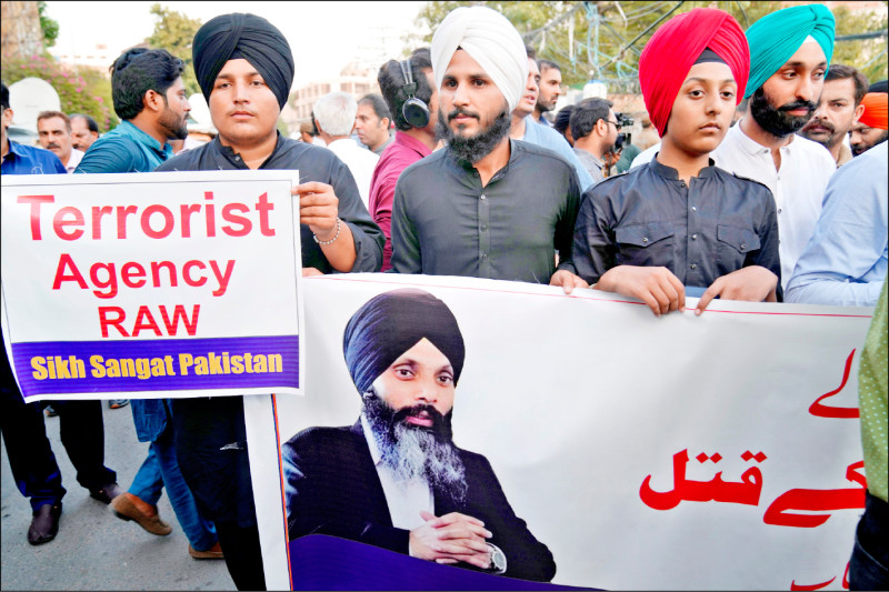 錫克教領袖尼賈爾具有加拿大公民身分,去年6月在溫哥華地區遭暗殺身亡,支持者在巴基斯坦上街抗議。(美聯社檔案照)