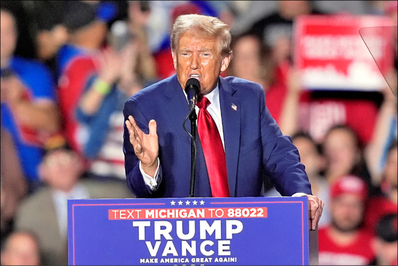 川普十七日受訪指出,如果中國入侵台灣,他會對中國加徵一五○%至二○○%關稅,也可能全面終止美中貿易。圖為他十八日在密西根州底特律市造勢。(美聯社)