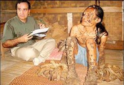 罹患全身長滿類似樹瘤與樹根怪病的印尼漁村村民「樹人」迪迪,與美國皮膚病專家加斯帕里合影。(取自英國每日電訊報網站)